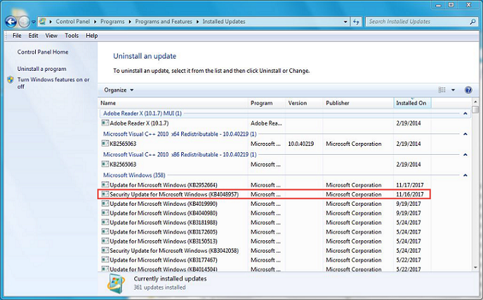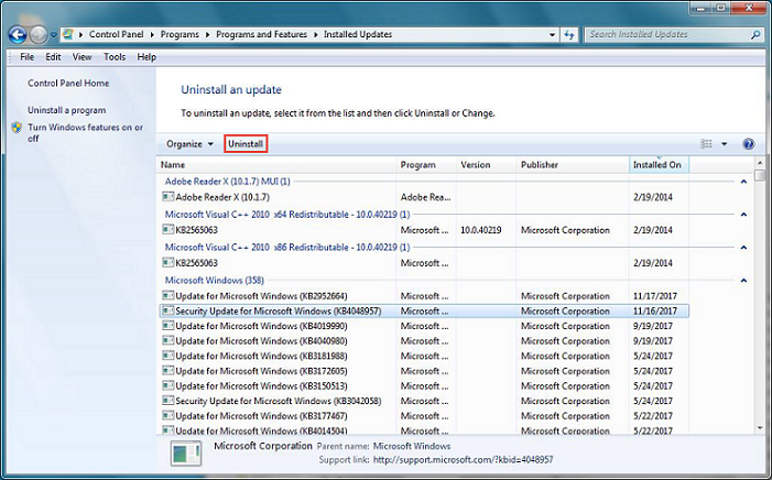 Step 4. On the Uninstall an Update screen, select the update for the version of Windows installed on the displayed list.