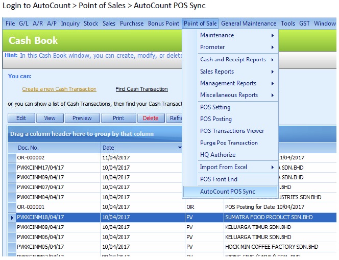 Go to AutoCount > Point of Sales > AutoCount POS SYNC